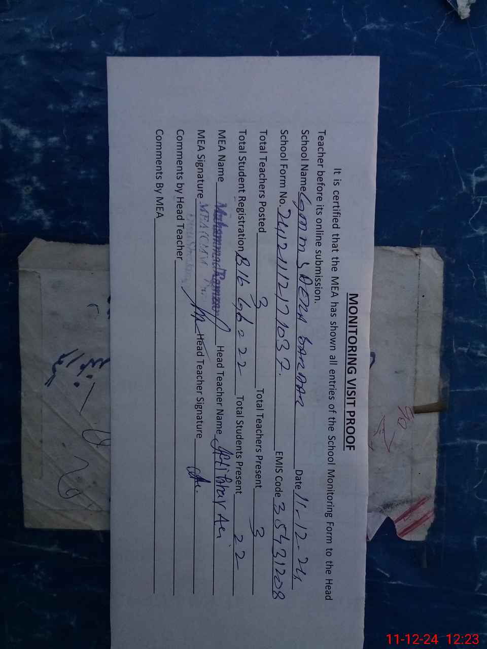 | Attendance Register | Head Teacher | MEA with School | Visit Proof |