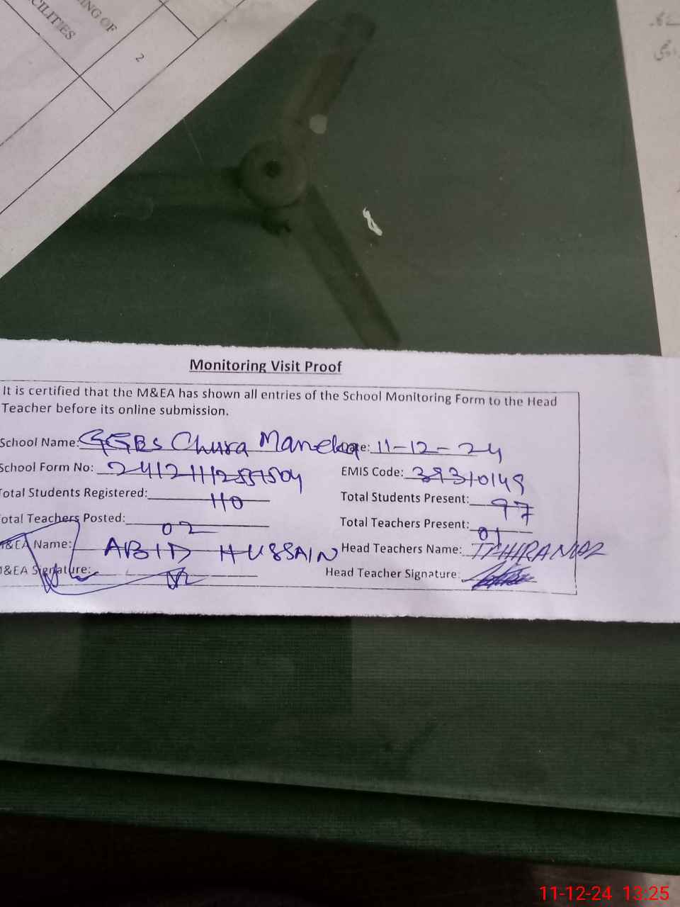 | Attendance Register | Head Teacher | MEA with School | Visit Proof |