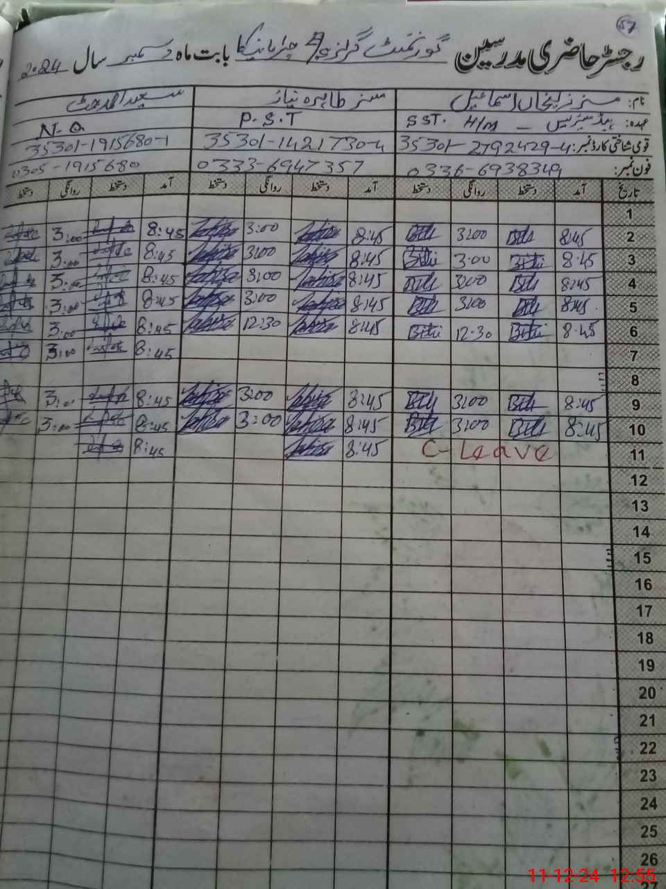 | CNIC | Full Name | Designation | R/C | Absence during last cal. month |