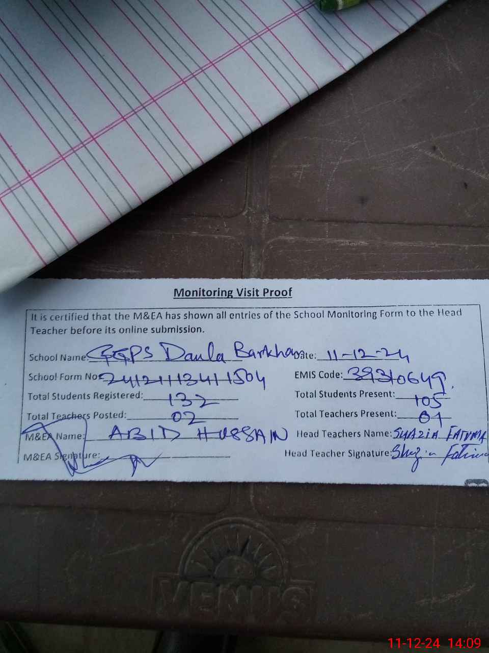 | Attendance Register | Head Teacher | MEA with School | Visit Proof |