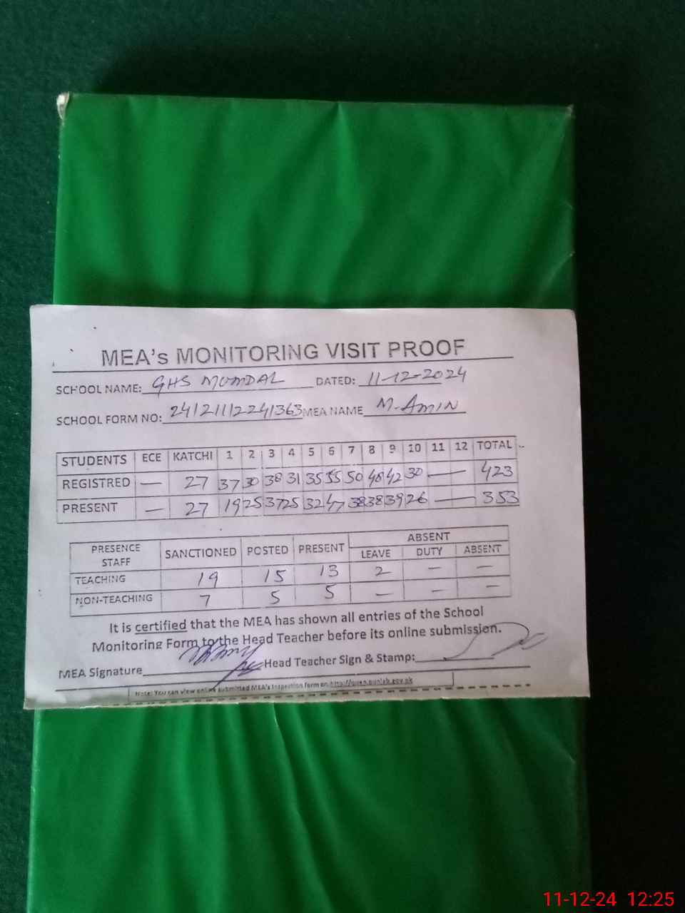 | Attendance Register | Head Teacher | MEA with School | Visit Proof |
