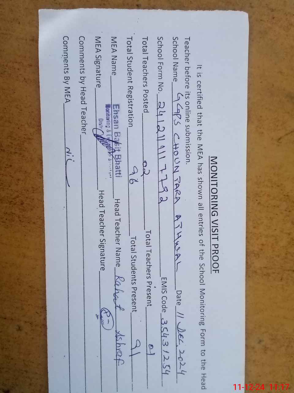 | EMIS Code: 35431254 | Name of School: GGPS CHOUNTARA ATHWAL | |||