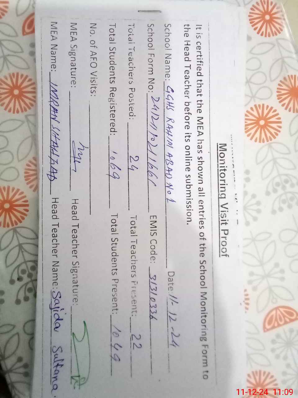 | Attendance Register | Head Teacher | MEA with School | Visit Proof |