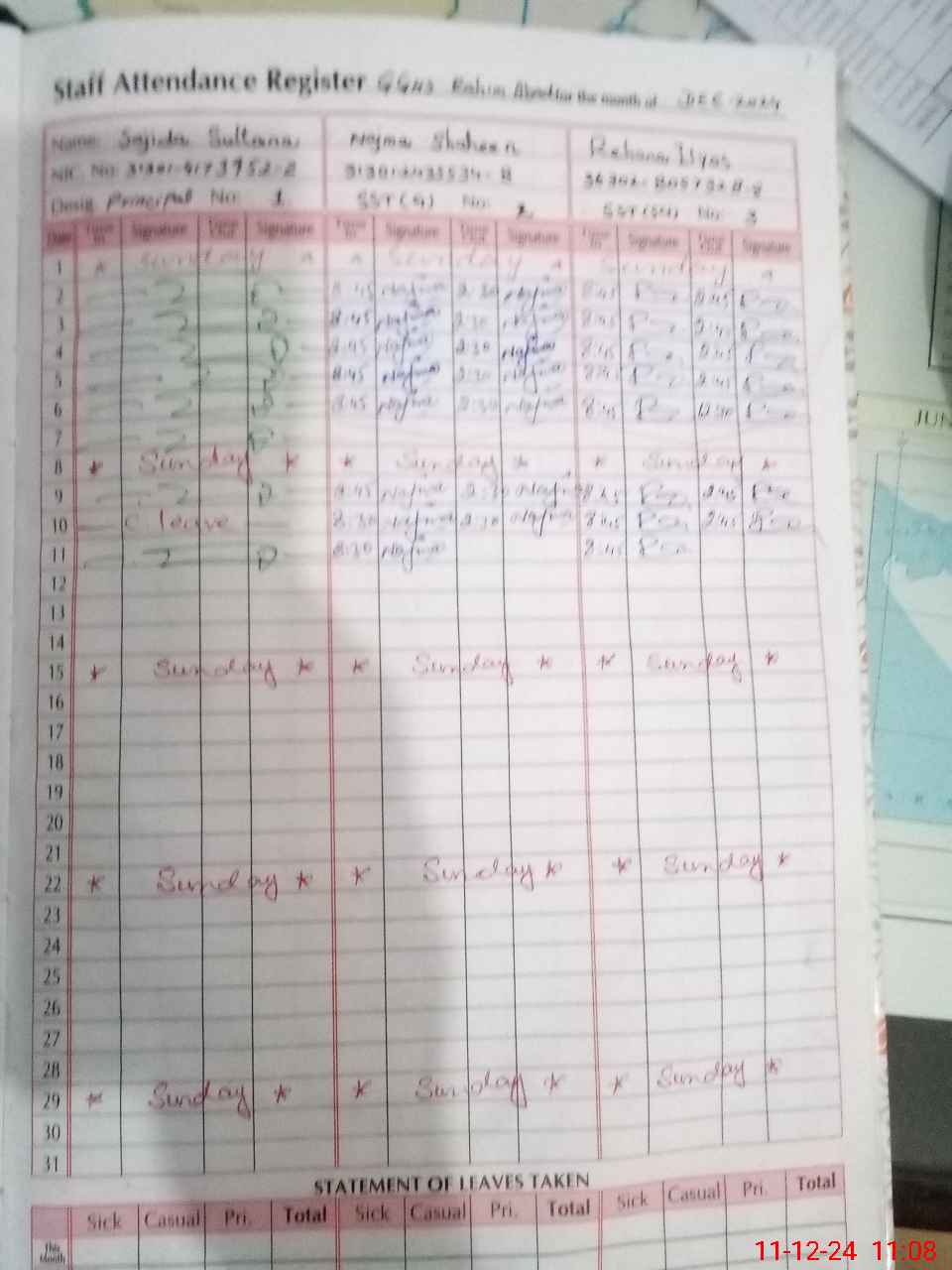 | CNIC | Full Name | Designation | R/C | Absence During Last Calender Month |