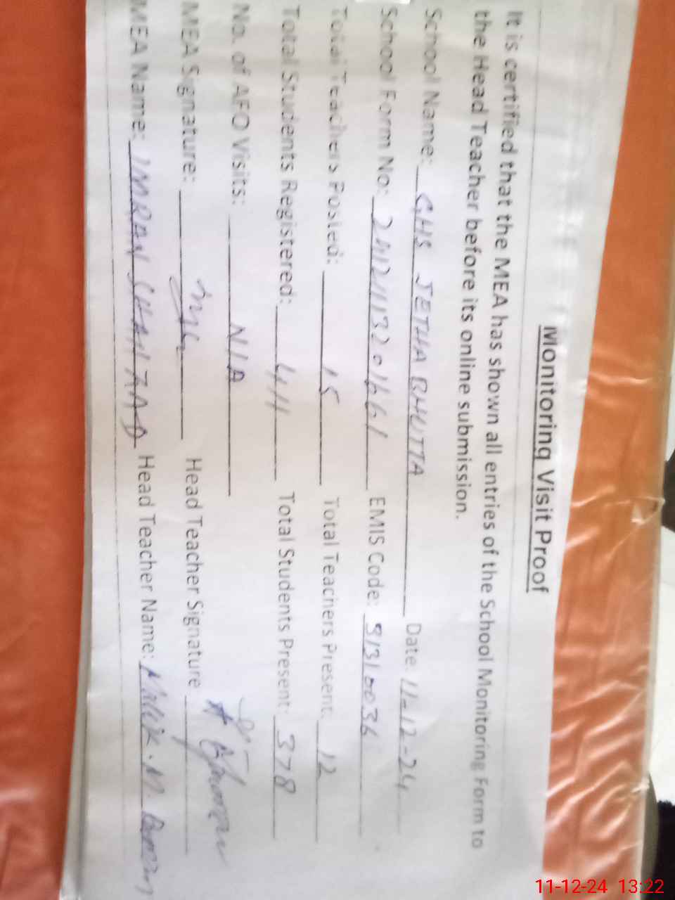 | Attendance Register | Head Teacher | MEA with School | Visit Proof |
