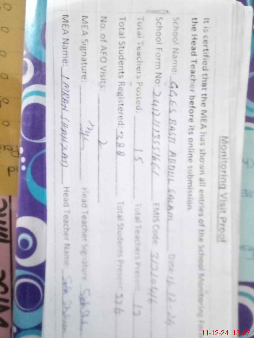 | Attendance Register | Head Teacher | MEA with School | Visit Proof |