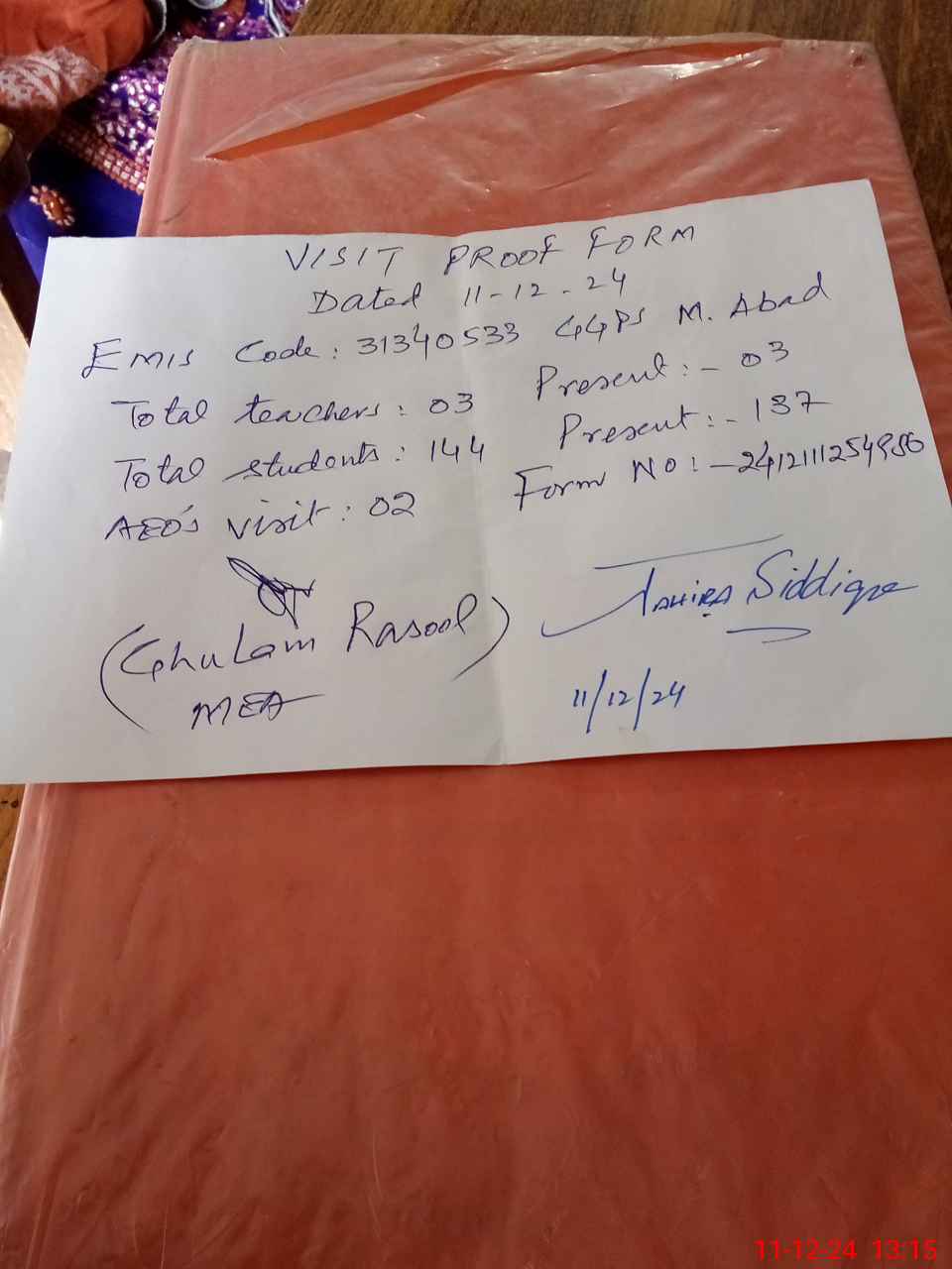 | Attendance Register | Head Teacher | MEA with School | Visit Proof |