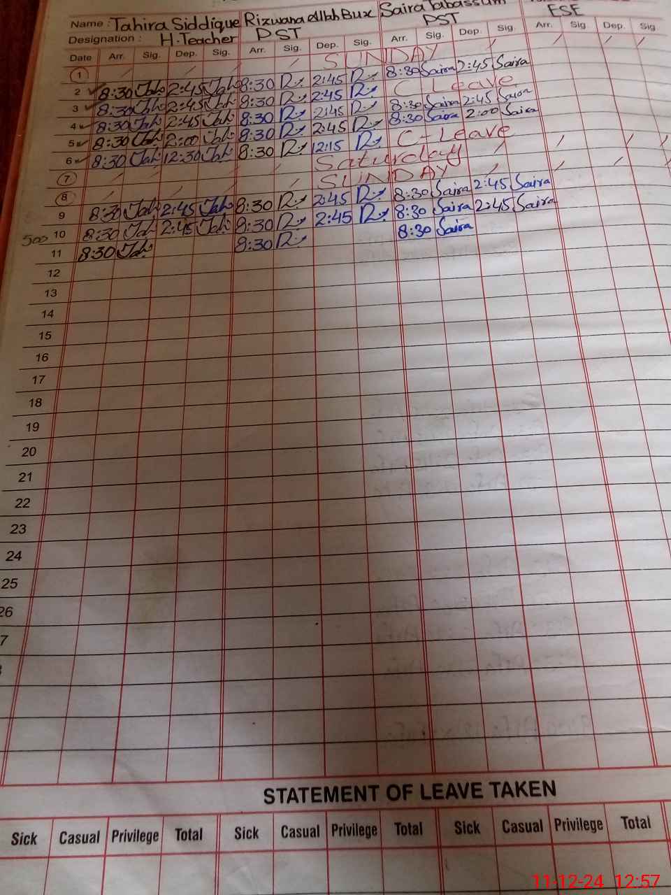 | CNIC | Full Name | Designation | R/C | Absence During Last Calender Month |