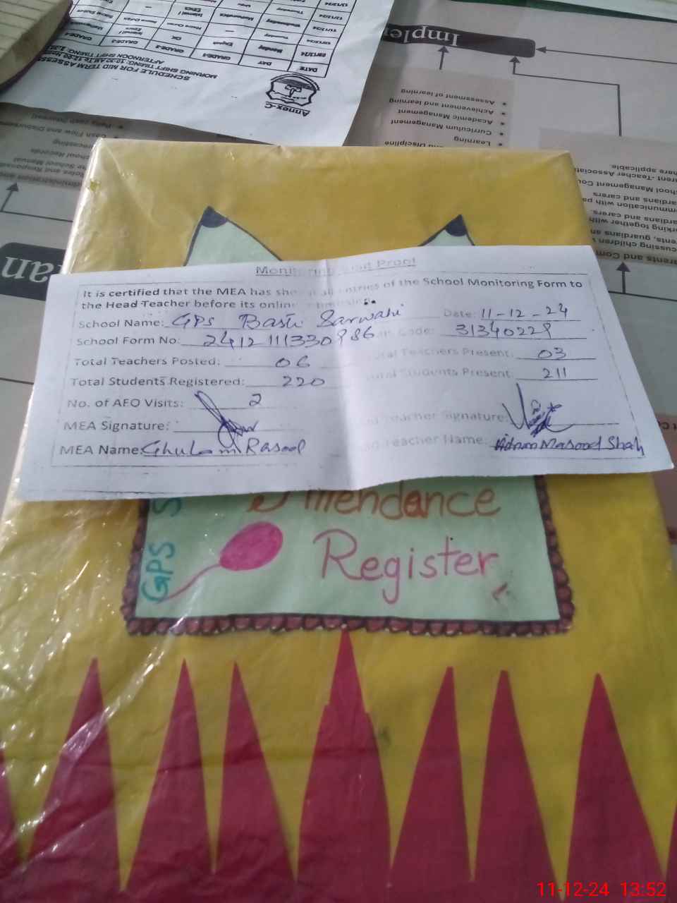 | Attendance Register | Head Teacher | MEA with School | Visit Proof |