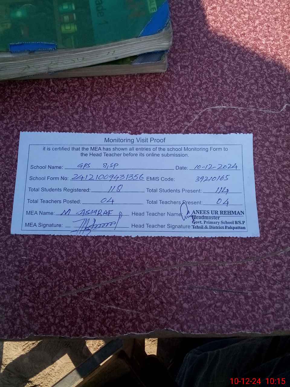 | Attendance Register | Head Teacher | MEA with School | Visit Proof |