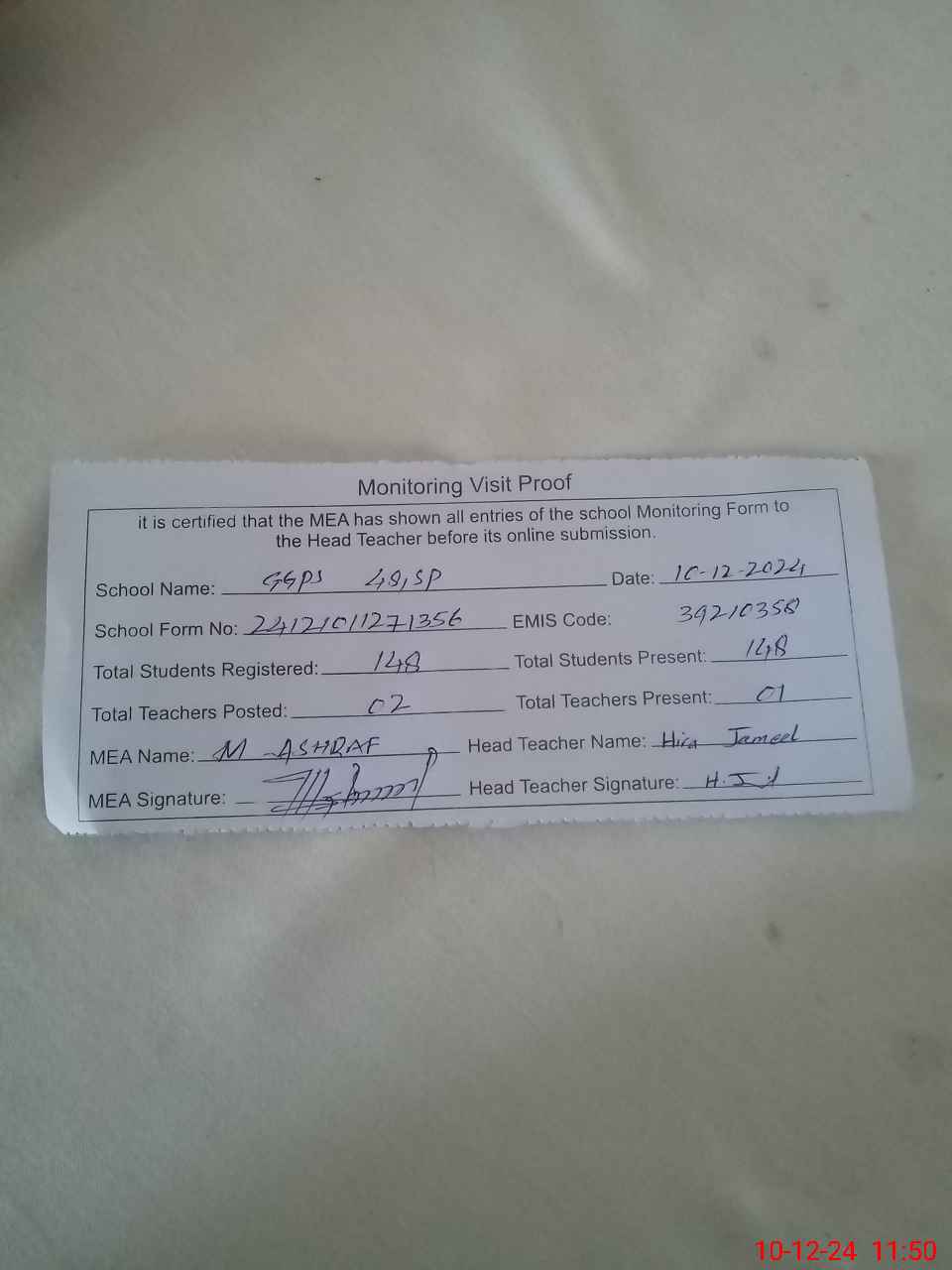 | Monitoring Date: 10-12-2024 | Start Time: 10-12-2024 11:27 AM | End Time: 10-12-2024 11:55 AM | Name of MEA: MU**** AS**** | |