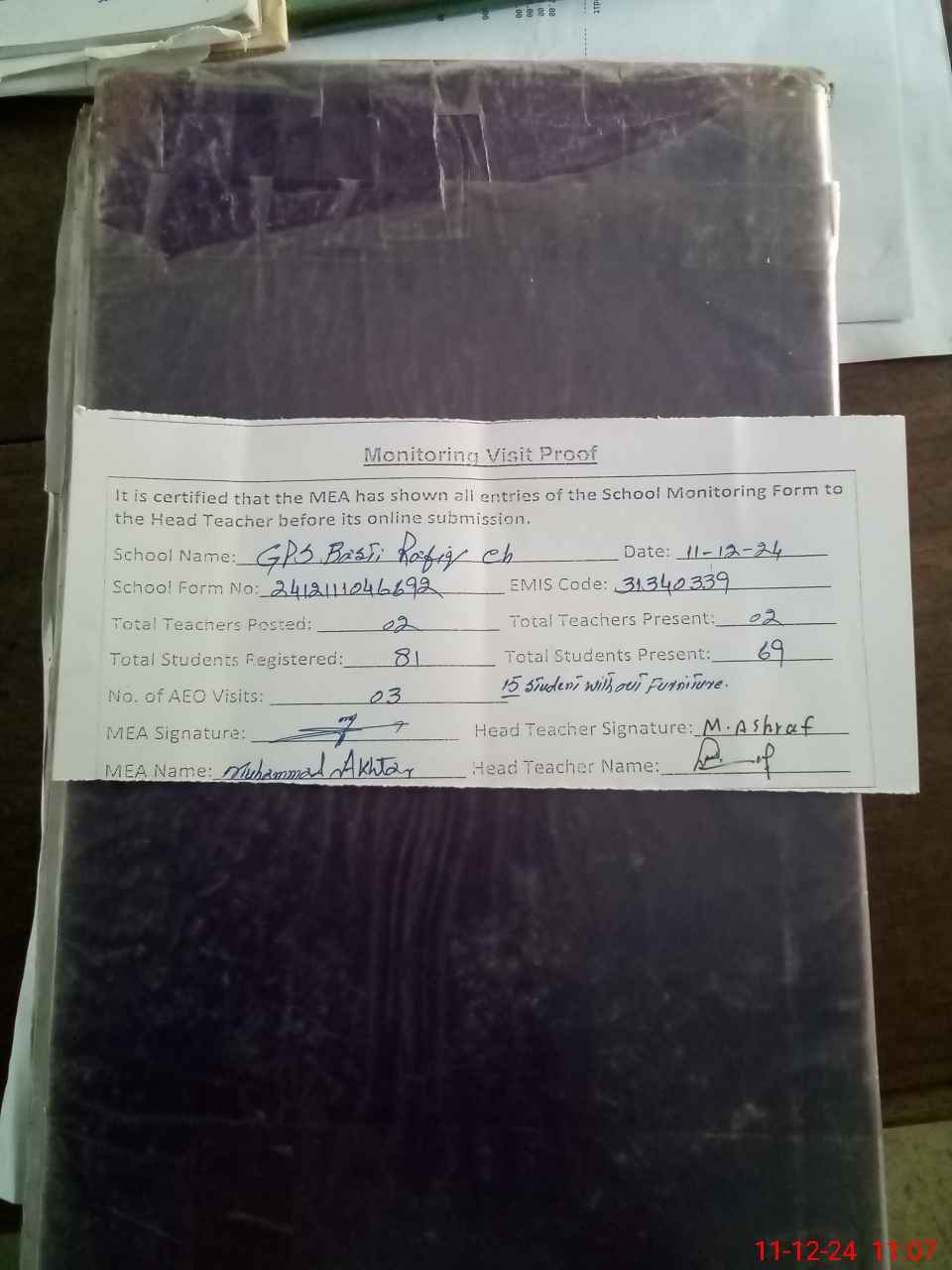| Attendance Register | Head Teacher | MEA with School | Visit Proof |
