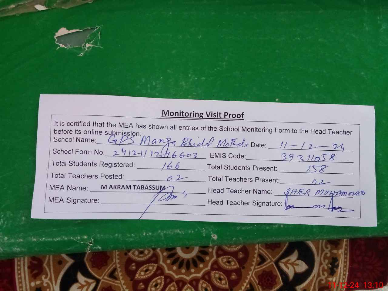 | EMIS Code: 39311058 | Name of School: GPS MANGA BHIDAL MATHELA | |||