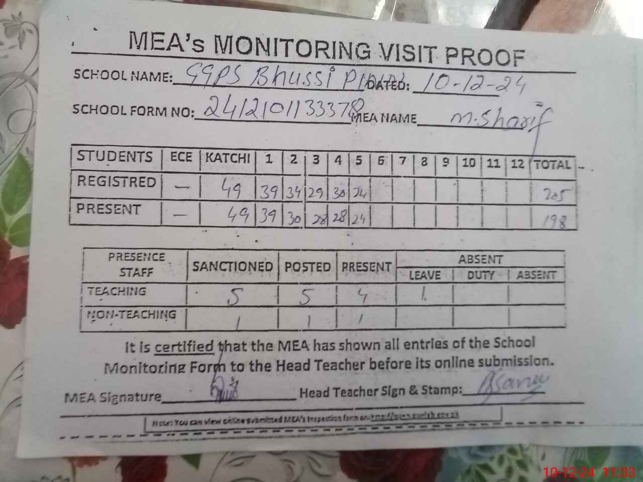 | Attendance Register | Head Teacher | MEA with School | Visit Proof |