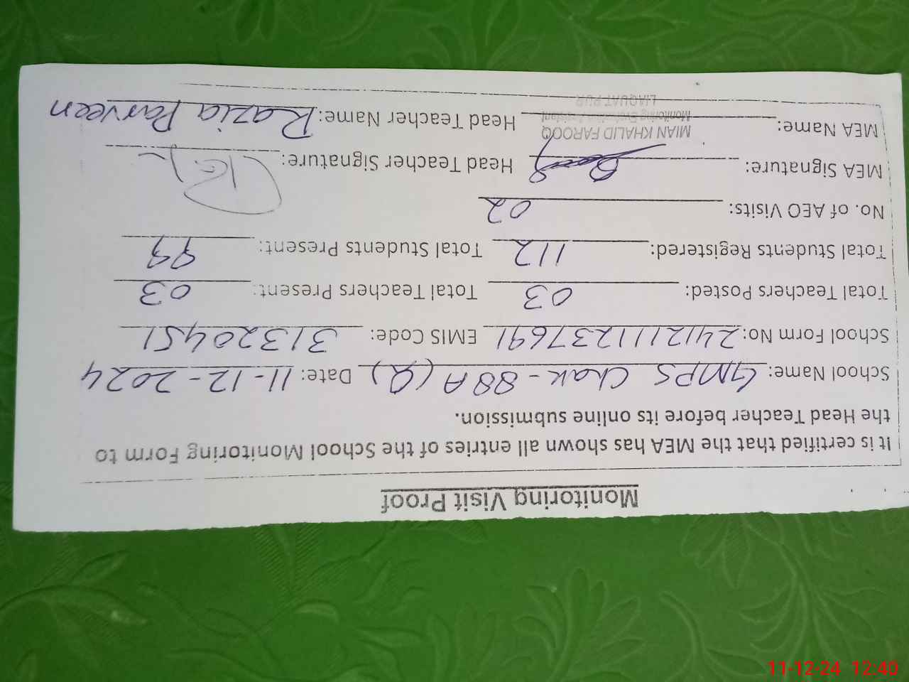 | Monitoring Date: 11-12-2024 | Start Time: 11-12-2024 12:02 PM | End Time: 11-12-2024 12:41 PM | Name of MEA: Kh**** Fa**** | |