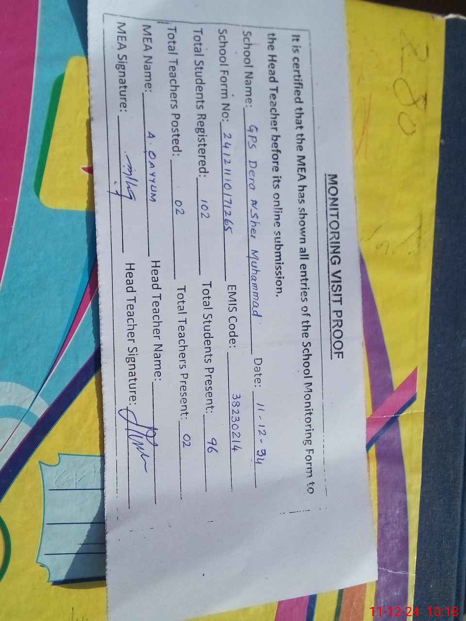 | Attendance Register | Head Teacher | MEA with School | Visit Proof |