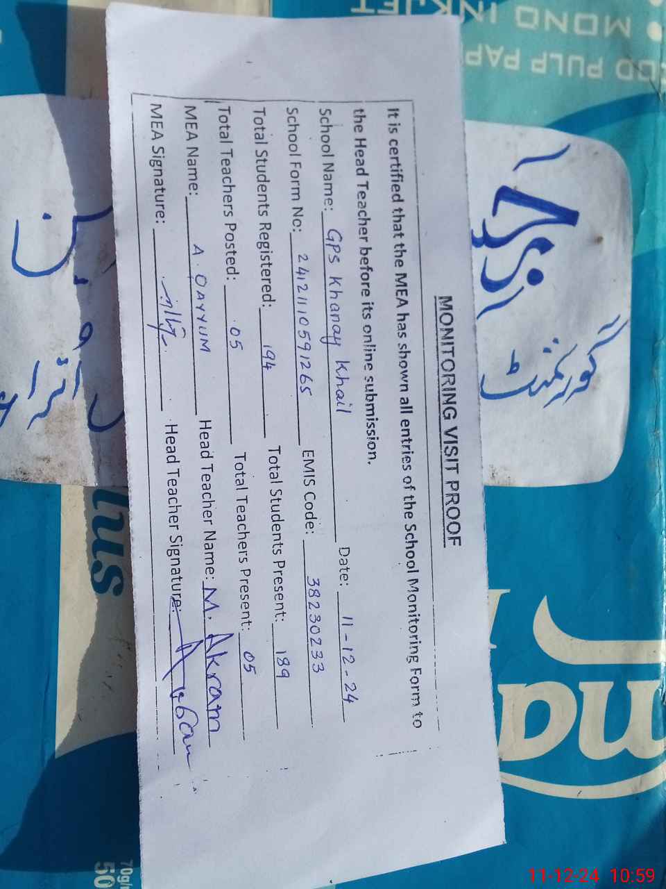 | EMIS Code: 38230233 | Name of School: GPS KHANAY KHAIL | |||