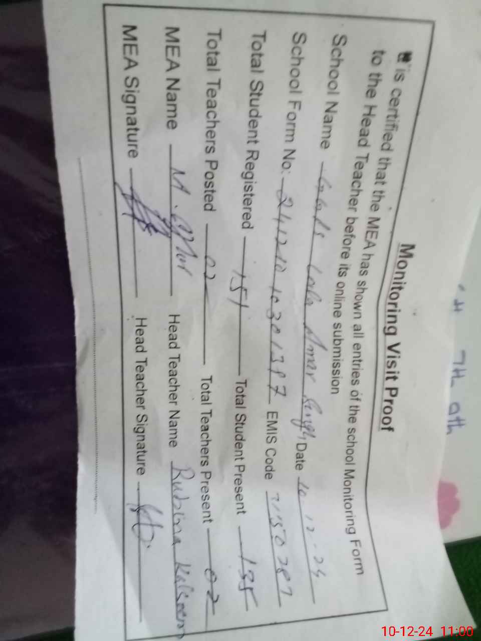 | Remarks (Use Separate Page if Required): AEO not visited the school last month and NSB RECORD NOT SHOWN TO MEA and students attendance register are not updated | |||||