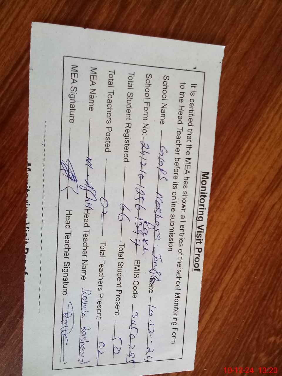 | Remarks (Use Separate Page if Required): AEO not visited the school last month and NSB RECORD NOT SHOWN TO MEA and students attendance register are not updated | |||||