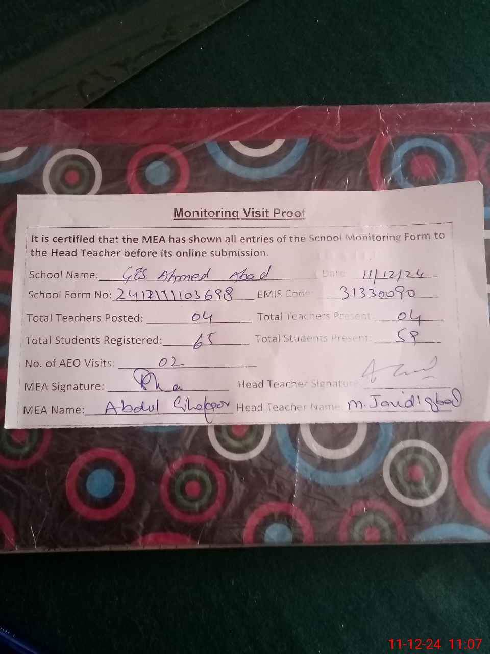 | Attendance Register | Head Teacher | MEA with School | Visit Proof |