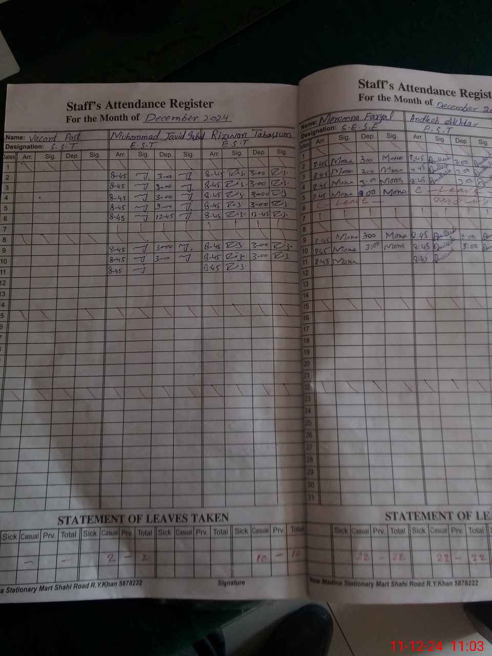 | CNIC | Full Name | Designation | R/C | Absence During Last Calender Month |