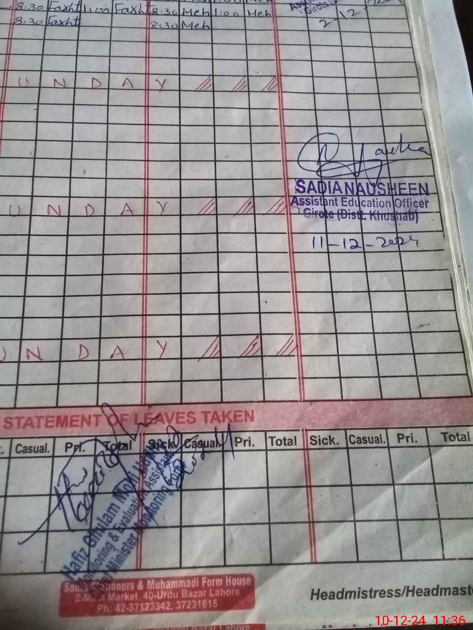 | CNIC | Full Name | Designation | R/C | Absence During Last Calender Month |