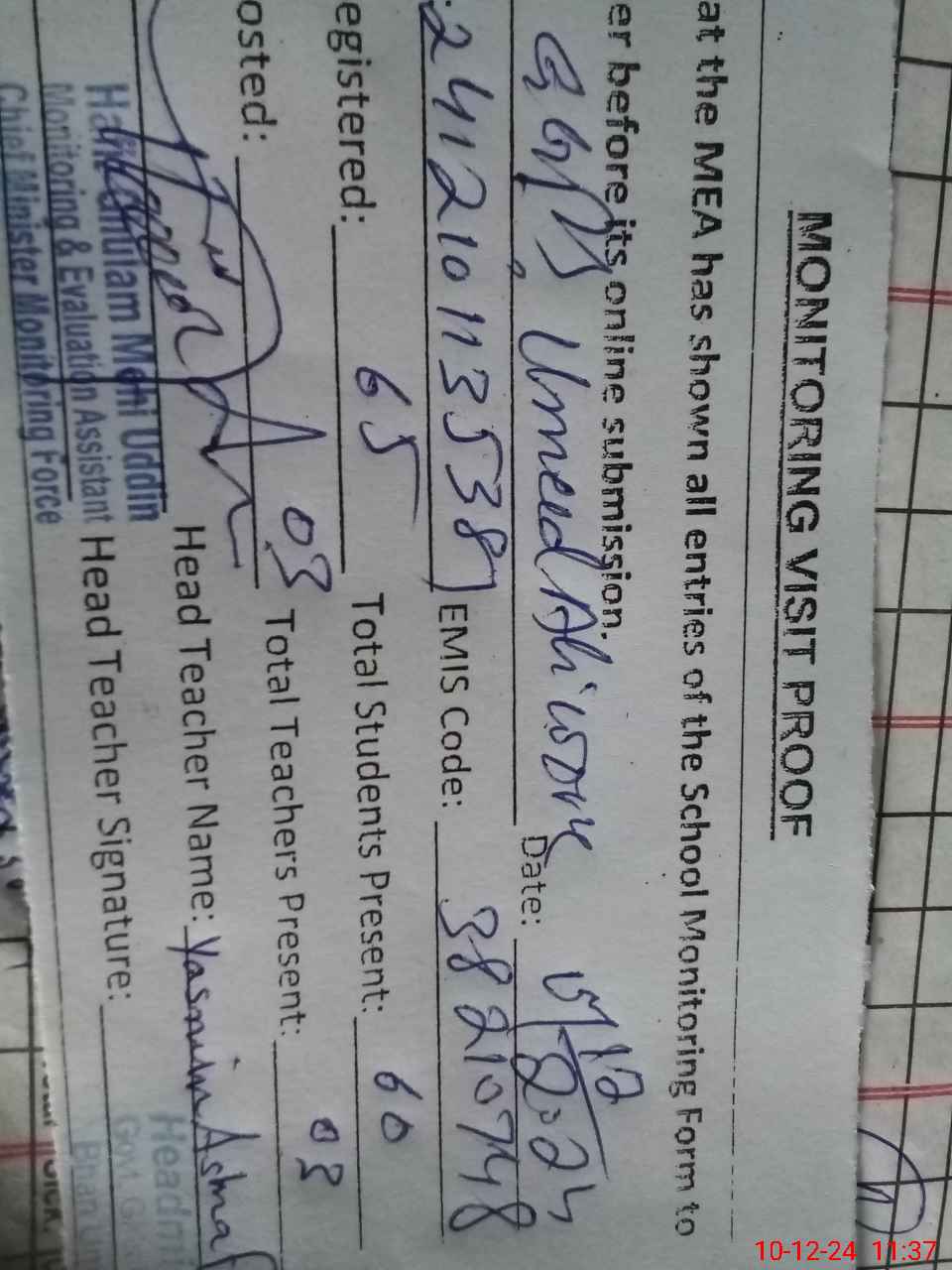| Attendance Register | Head Teacher | MEA with School | Visit Proof |