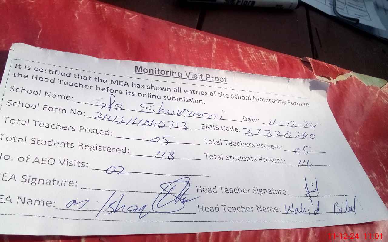 | Attendance Register | Head Teacher | MEA with School | Visit Proof |