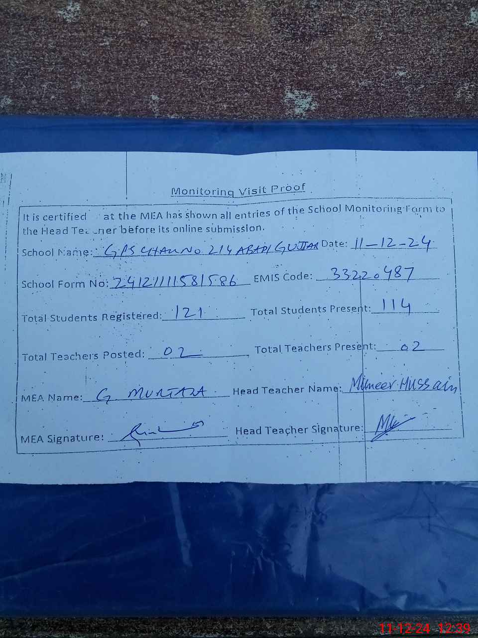 | EMIS Code: 33220487 | Name of School: GPS CHAK NO 214 ABADI JB GUJAR | |||