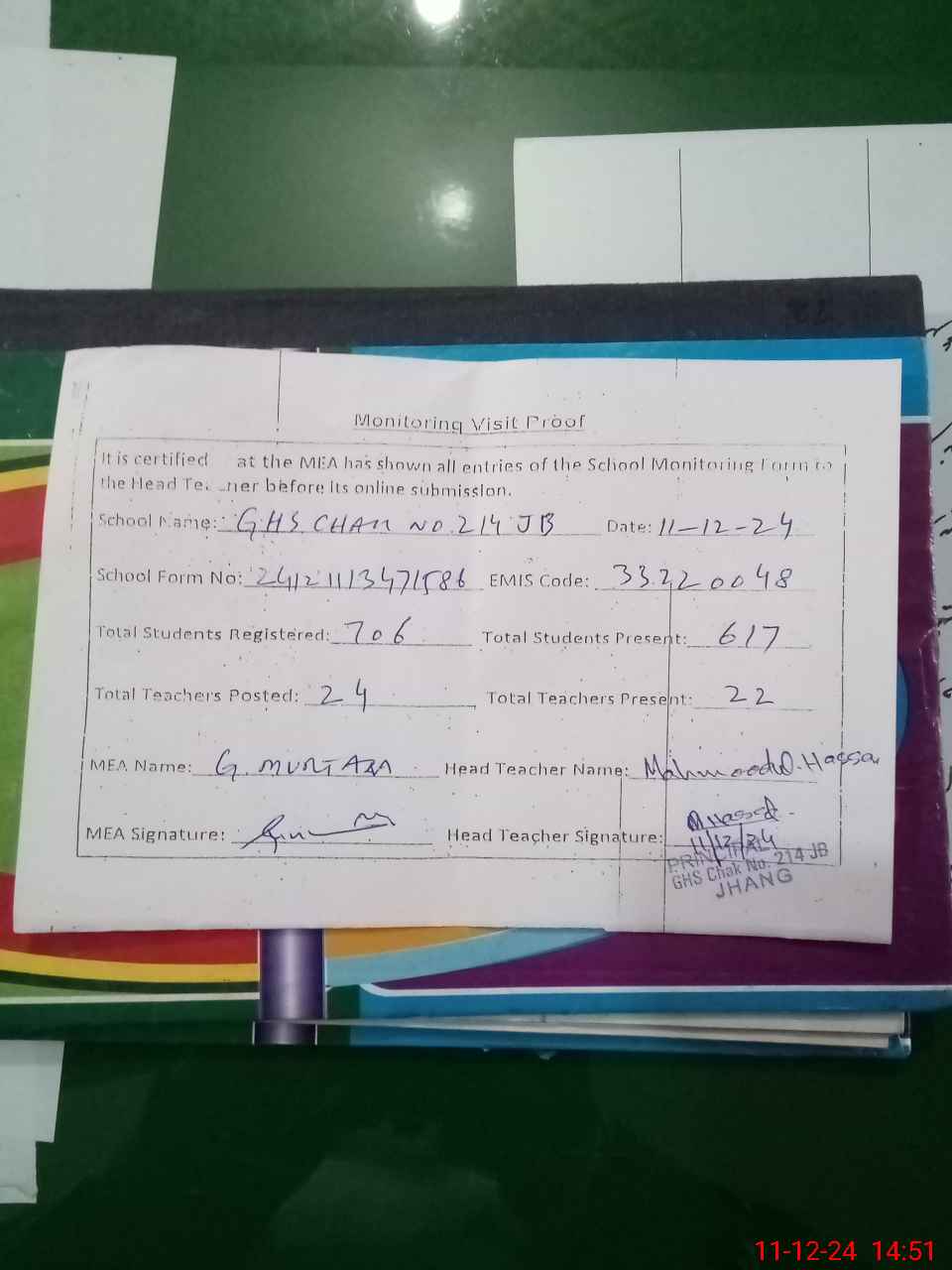 | Attendance Register | Head Teacher | MEA with School | Visit Proof |