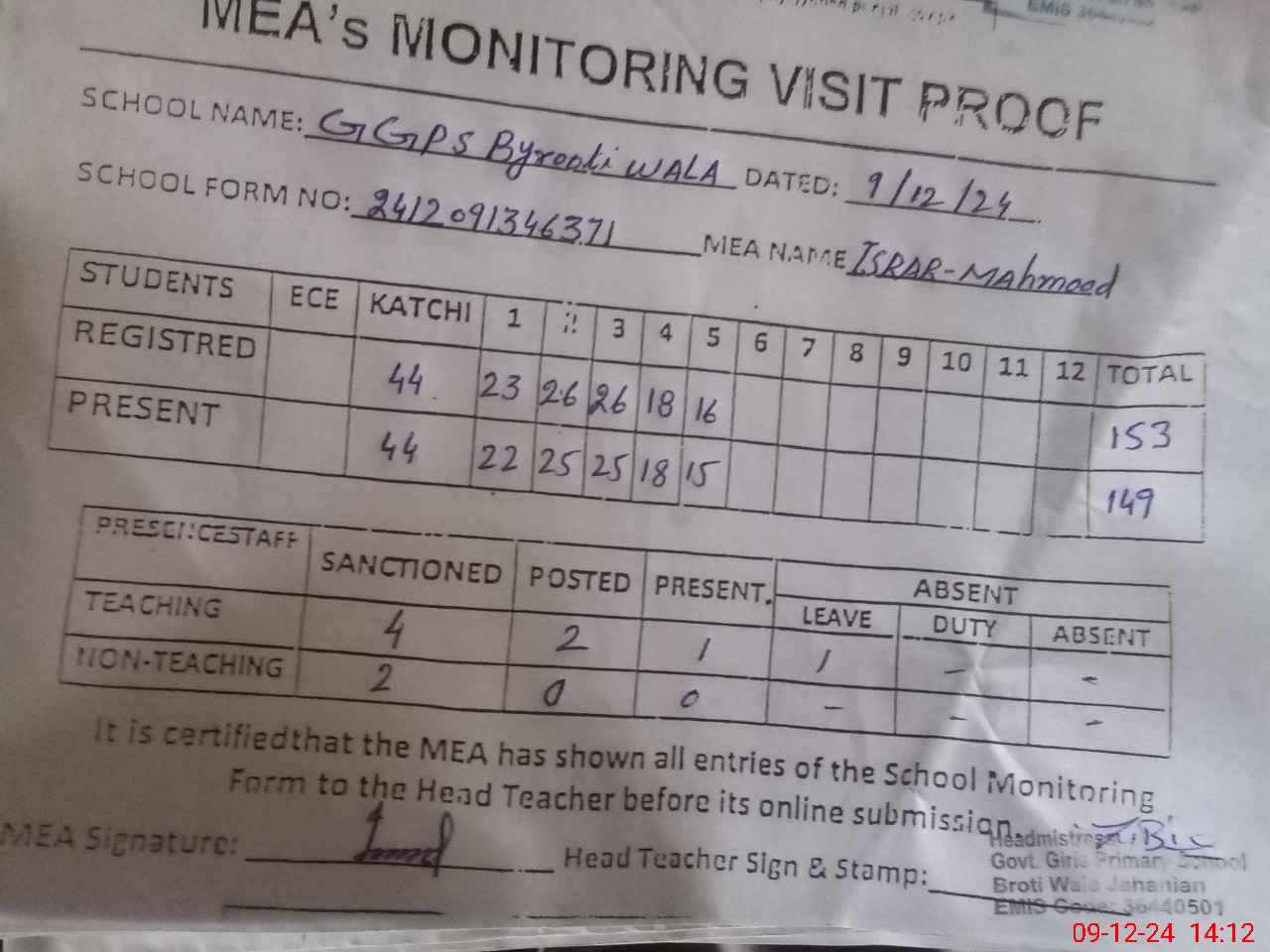 | Attendance Register | Head Teacher | MEA with School | Visit Proof |