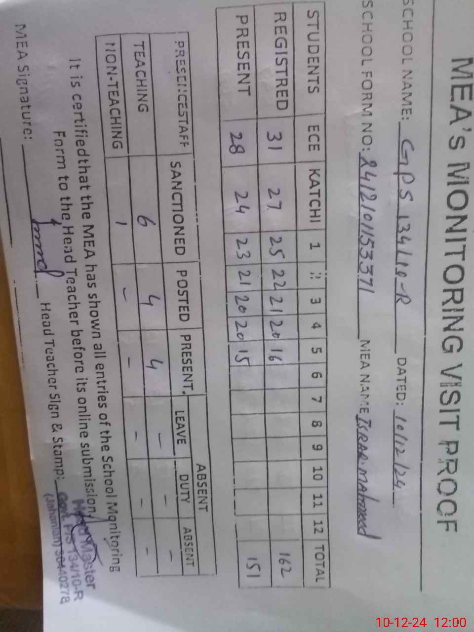 | Attendance Register | Head Teacher | MEA with School | Visit Proof |