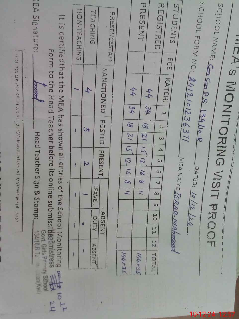 | Attendance Register | Head Teacher | MEA with School | Visit Proof |