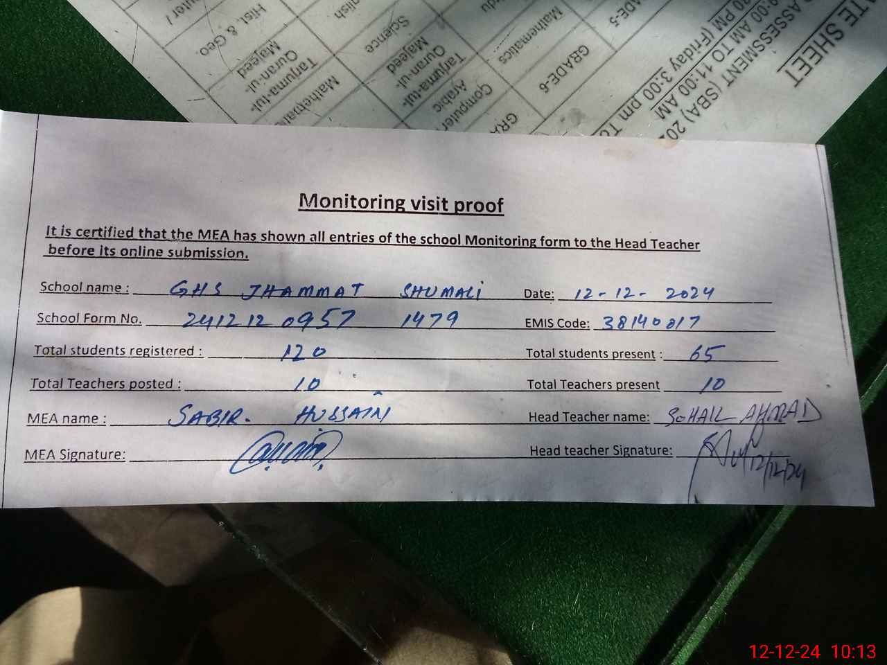 | Certified that this School was Inspected by the Undersigned MEA/DMO Today and the Information Stated Above is as Per Record. | |||||