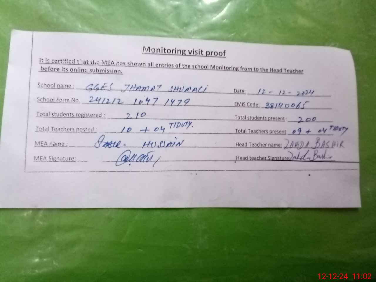 | Attendance Register | Head Teacher | MEA with School | Visit Proof |