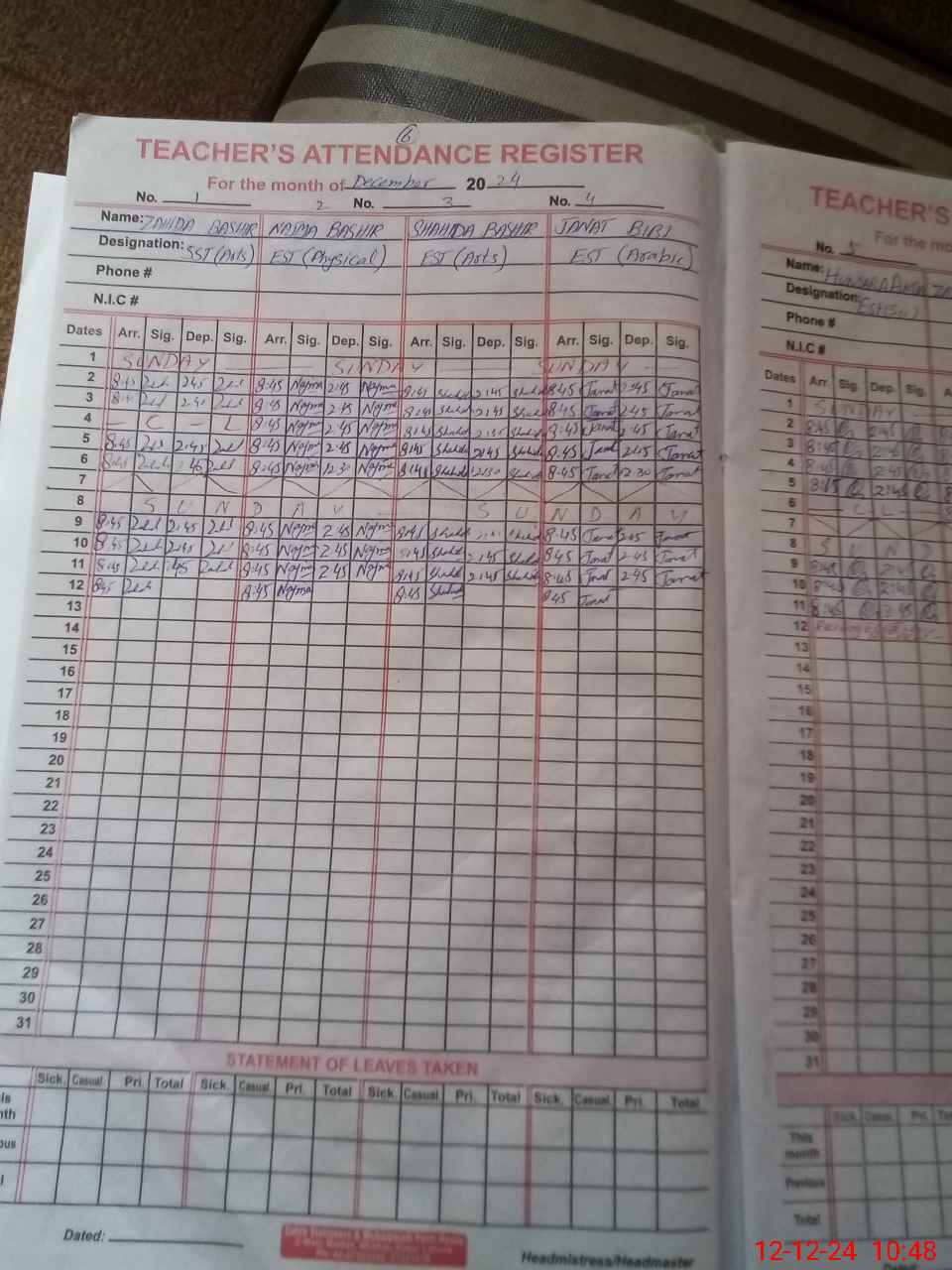 | CNIC | Full Name | Designation | R/C | Absence During Last Calender Month |