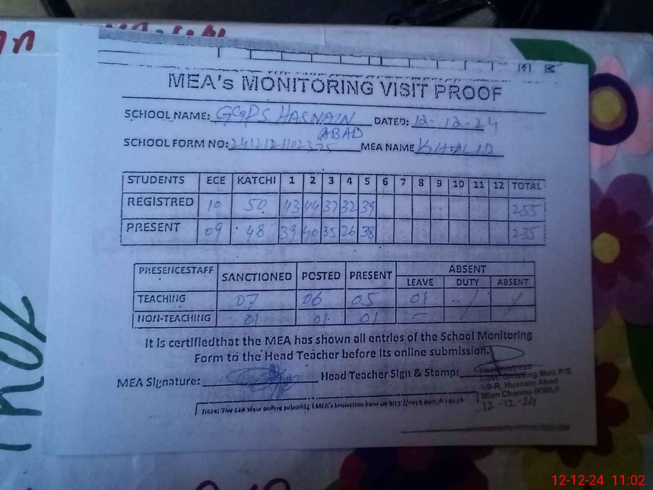 | Attendance Register | Head Teacher | MEA with School | Visit Proof |