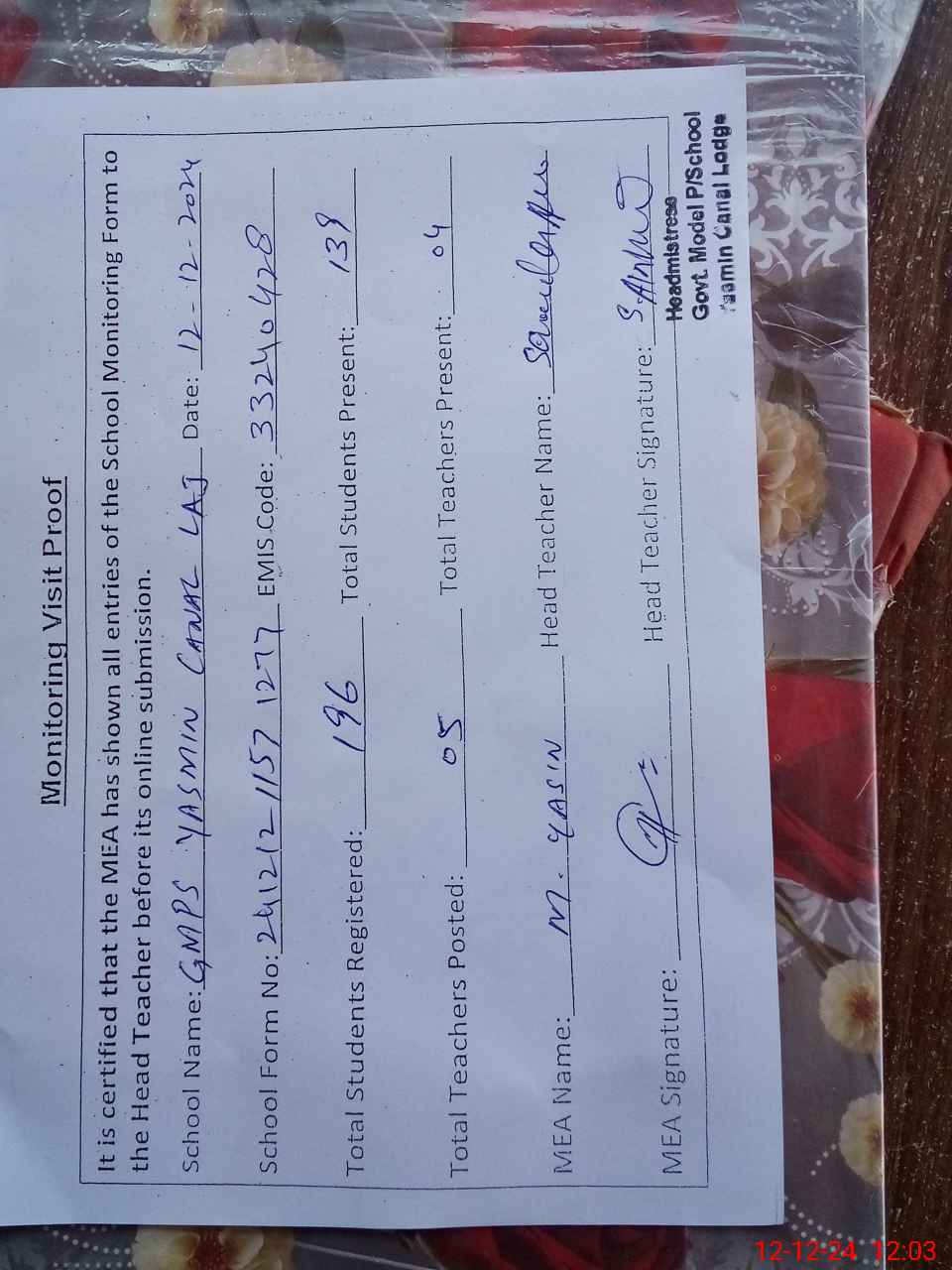 | EMIS Code: 33240428 | Name of School: GMPS YASMIN CANAL LODGE | |||