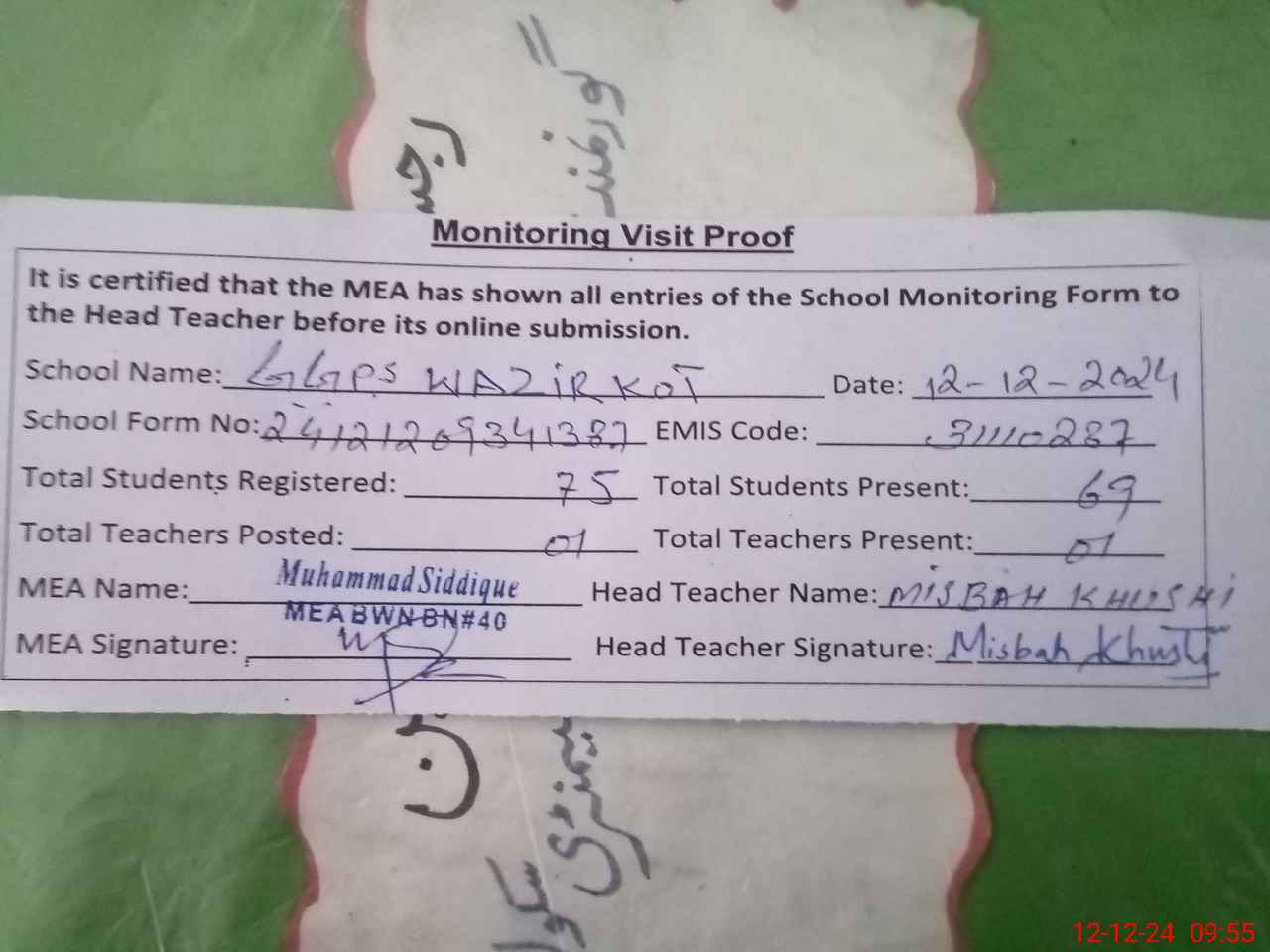 | Attendance Register | Head Teacher | MEA with School | Visit Proof |