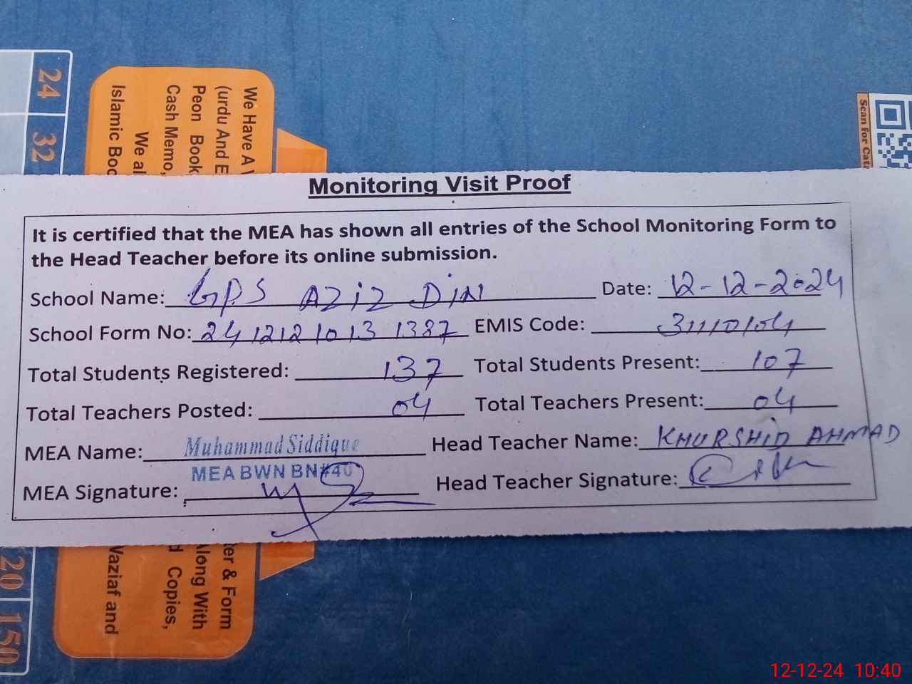 | EMIS Code: 31110104 | Name of School: GPS AZIZ DIN | |||