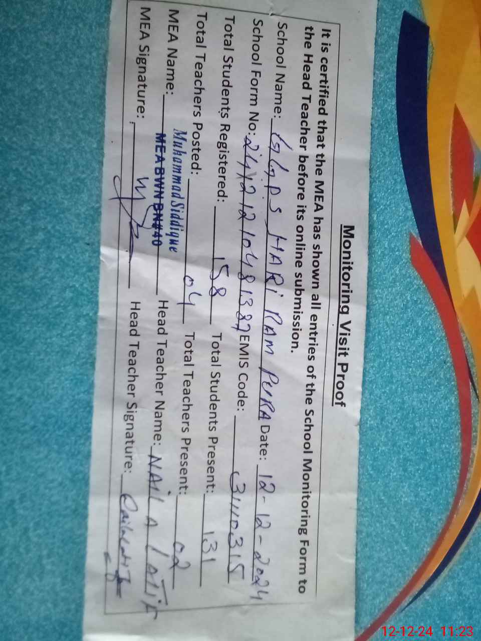 | Attendance Register | Head Teacher | MEA with School | Visit Proof |