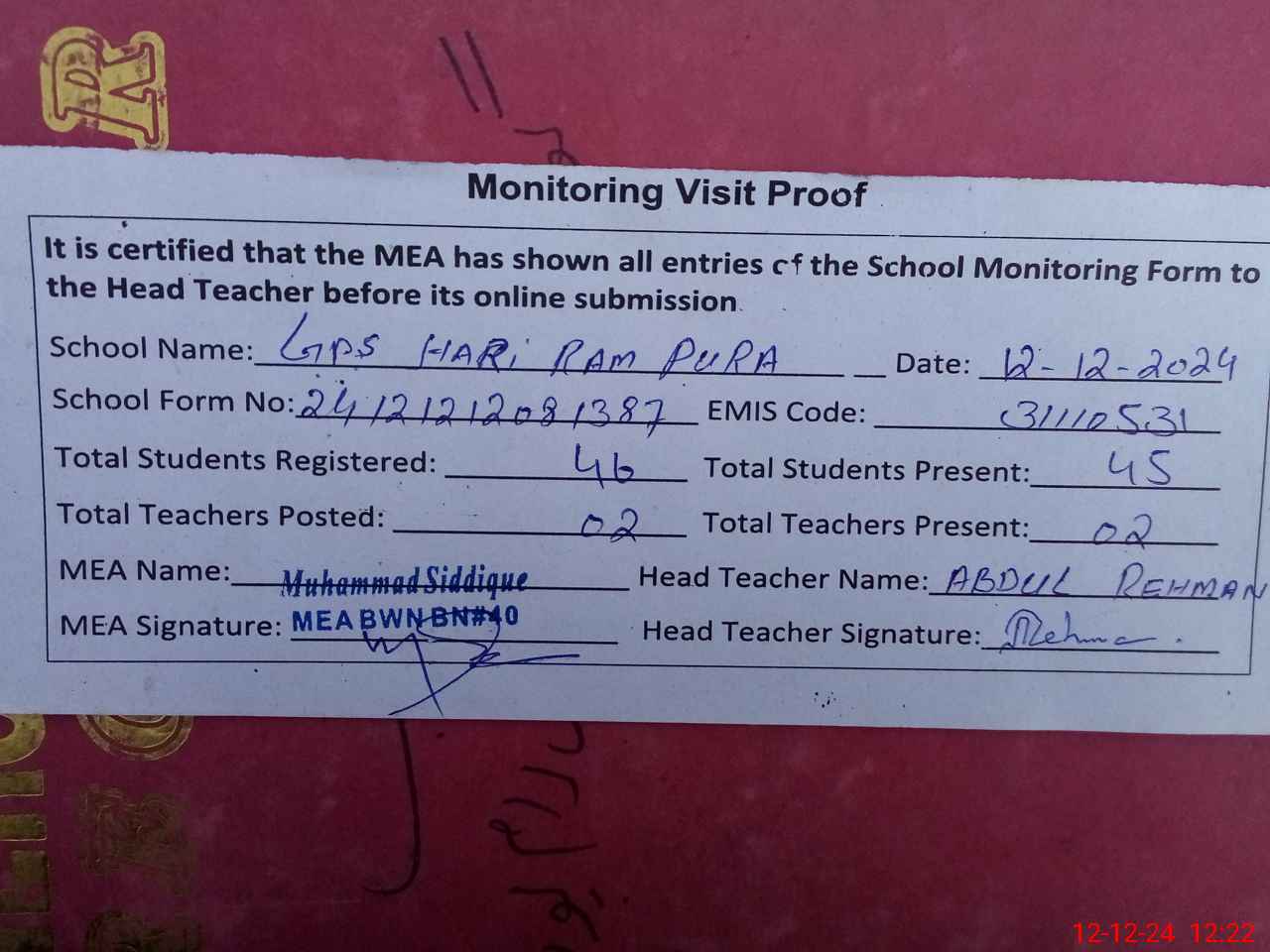| EMIS Code: 31110531 | Name of School: GPS HARI RAM PURA | |||