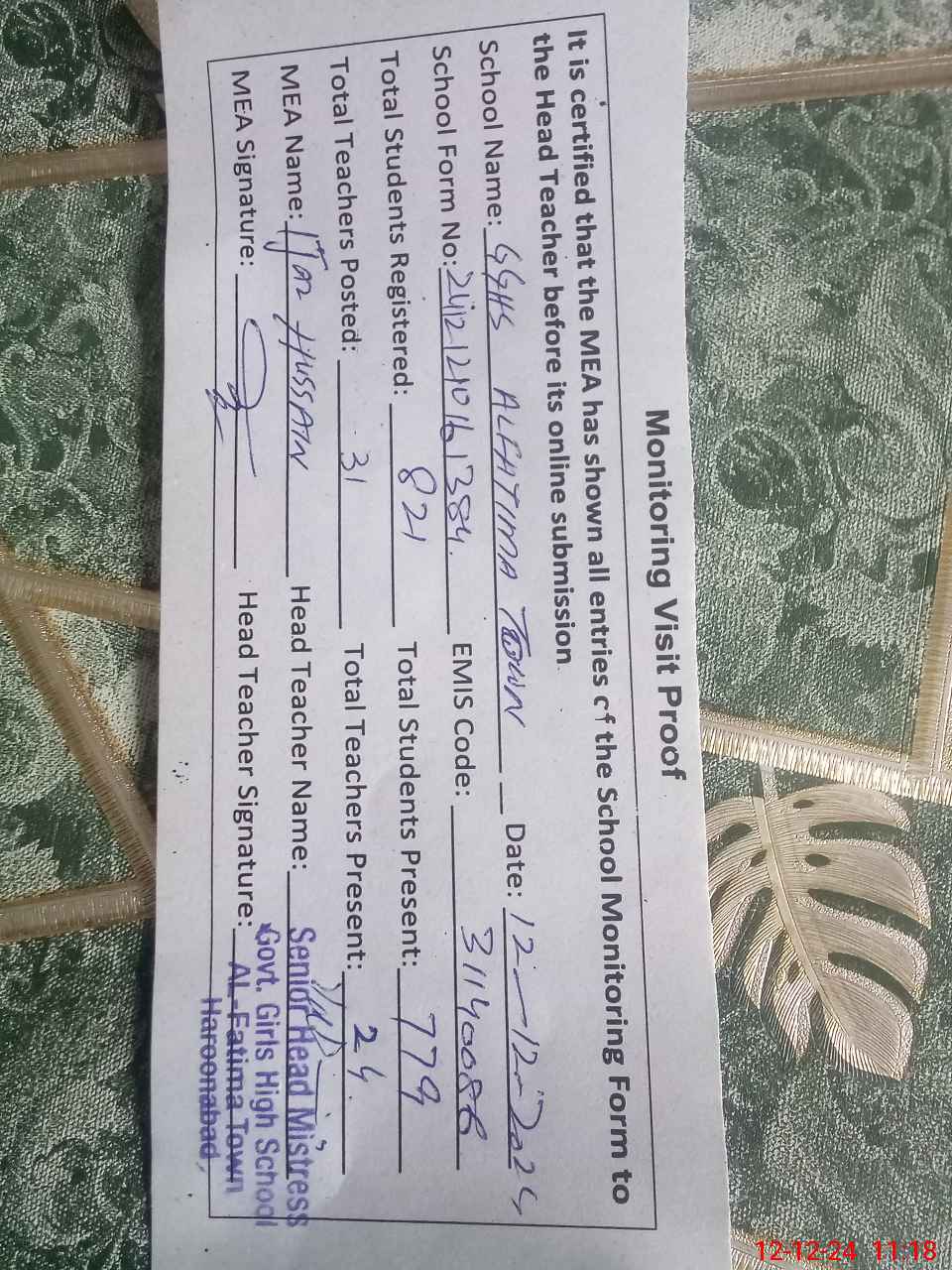| EMIS Code: 31140086 | Name of School: GGHS AL-FATIMA TOWN | |||