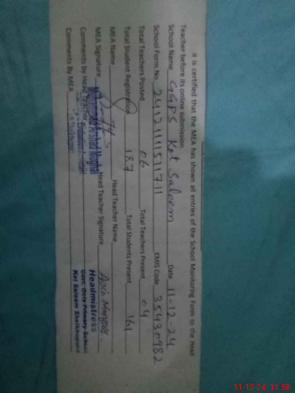 | Name: As**** Ma**** Designation: (School Headmaster's/Headmistress's) PST Phone/Cell Number: 03**** |