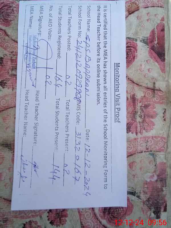 | Certified that this School was Inspected by the Undersigned MEA/DMO Today and the Information Stated Above is as Per Record. | |||||