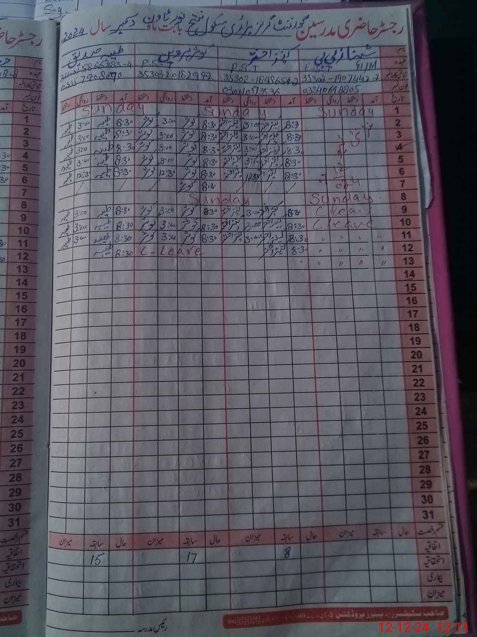 | CNIC | Full Name | Designation | R/C | Absence During Last Calender Month |