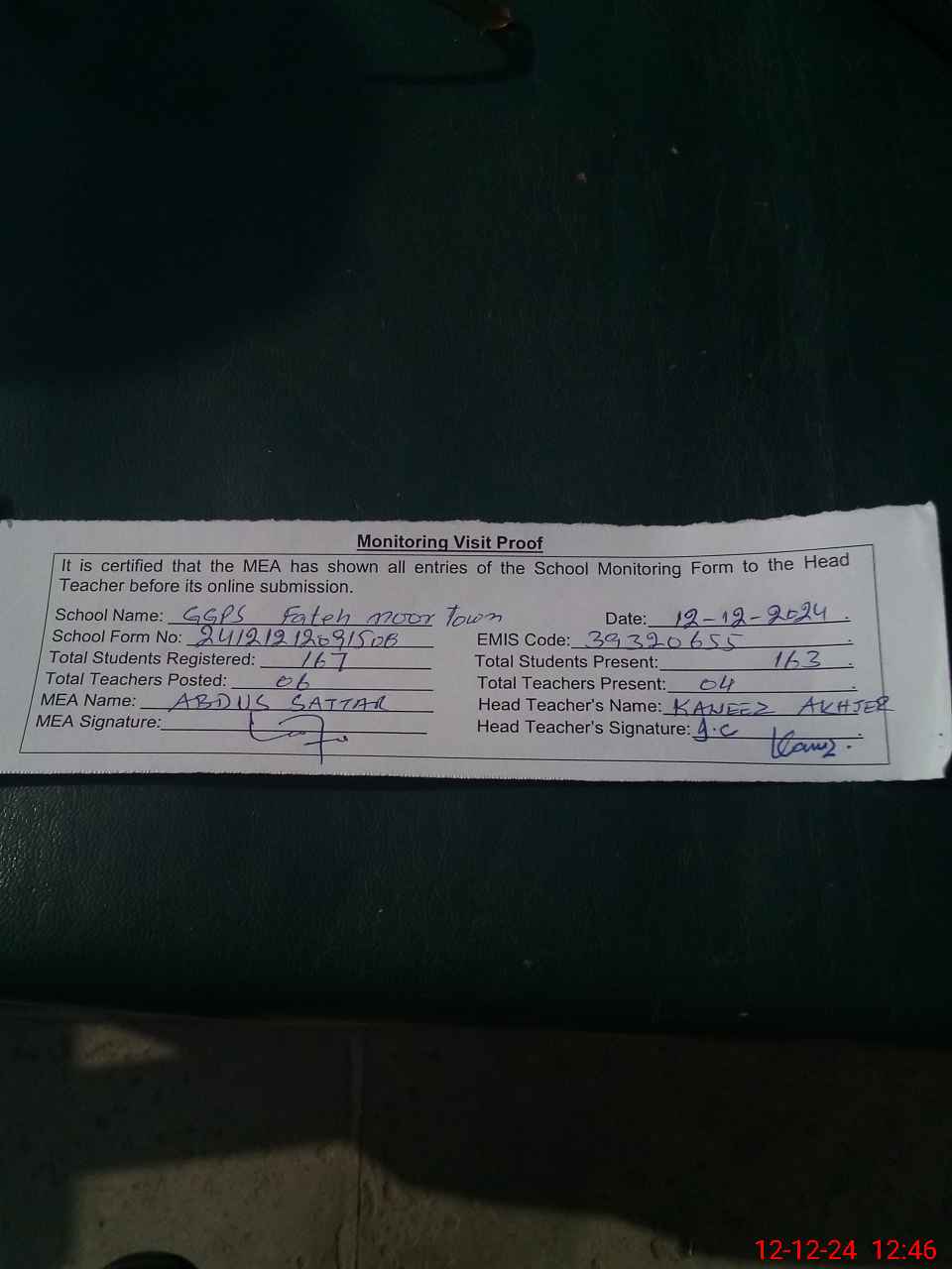 | Attendance Register | Head Teacher | MEA with School | Visit Proof |