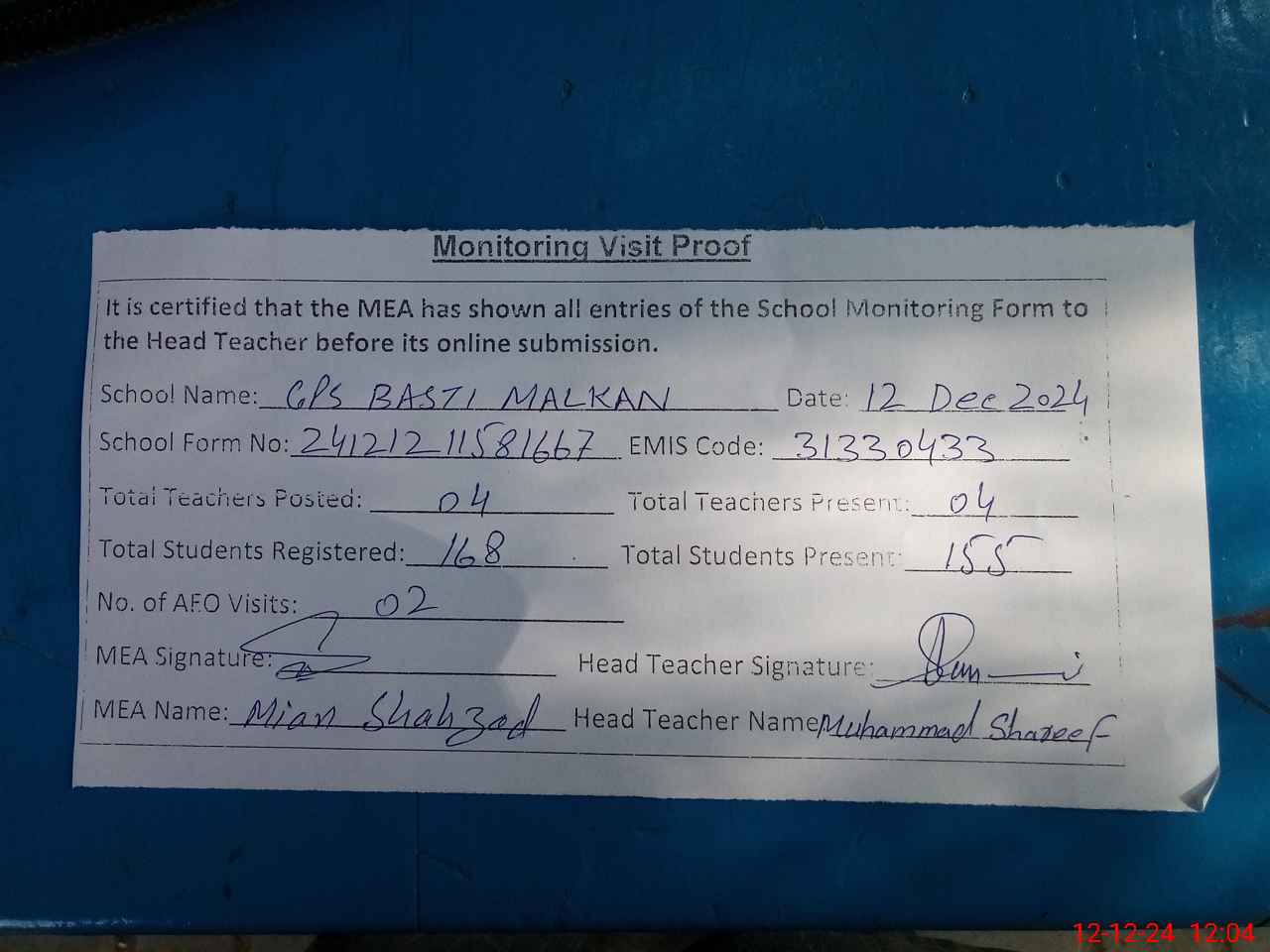 | EMIS Code: 31330433 | Name of School: GPS BASTI MALKAN | |||