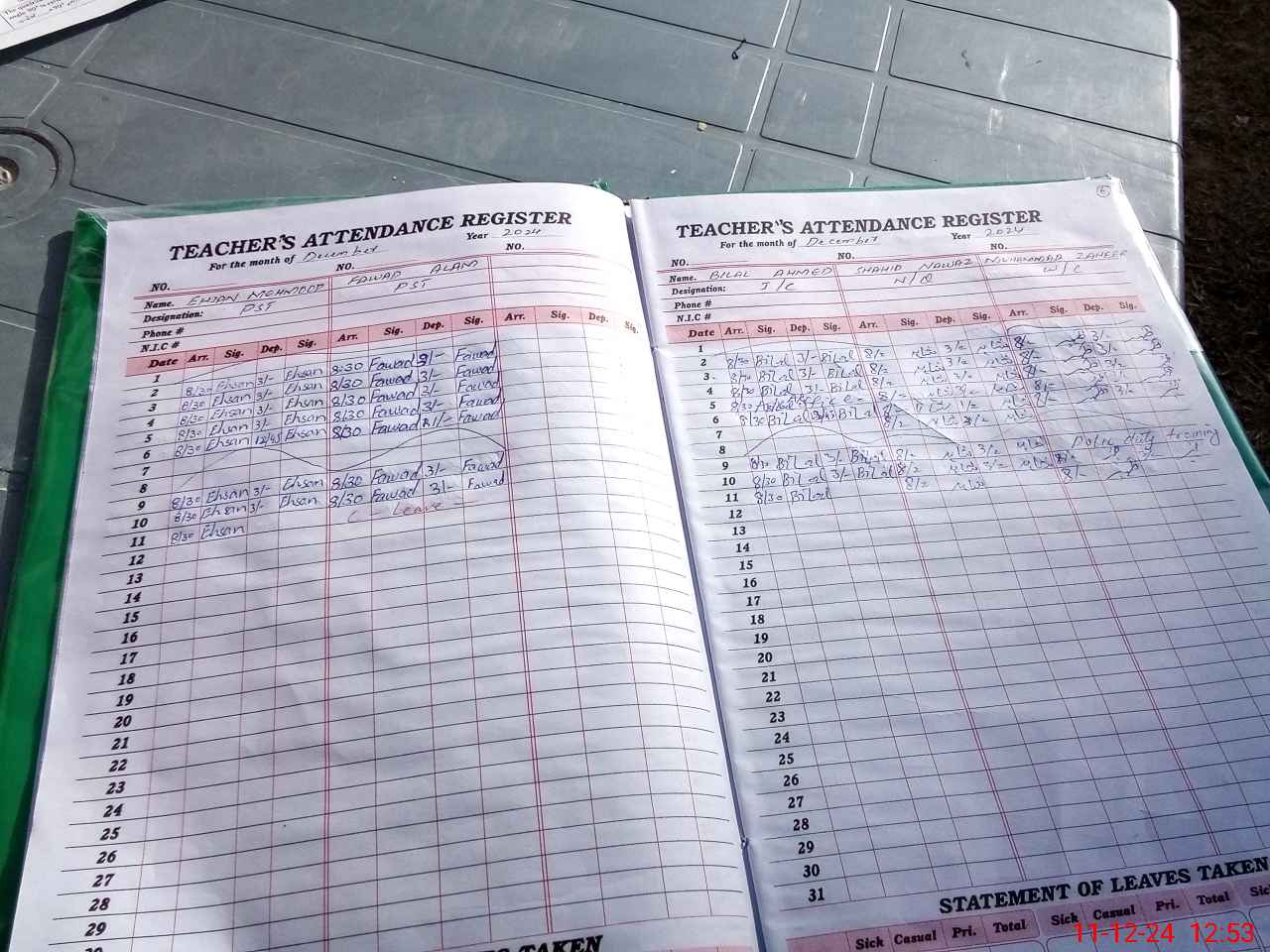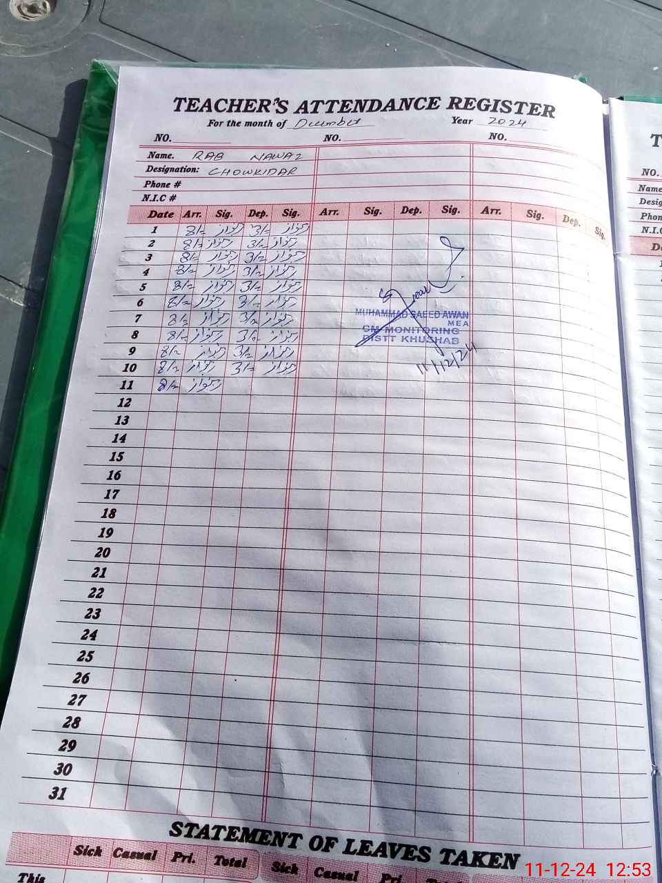 | CNIC | Full Name | Designation | R/C | Absence During Last Calender Month |