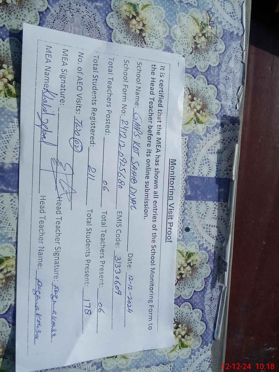 | Remarks (Use Separate Page if Required): Class verification is not updated on mea tab as per sis and teachers attendance not updated on sis today and two classes are sitting under shed one portion of school is closed consists of two class rooms and three toilets | |||||